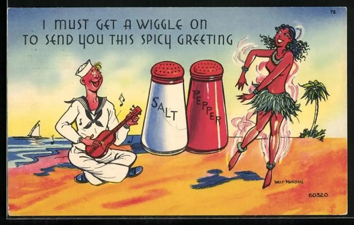 AK Matrose spielt für Hula-Tänzerin am Strand Gitarre, Erotik