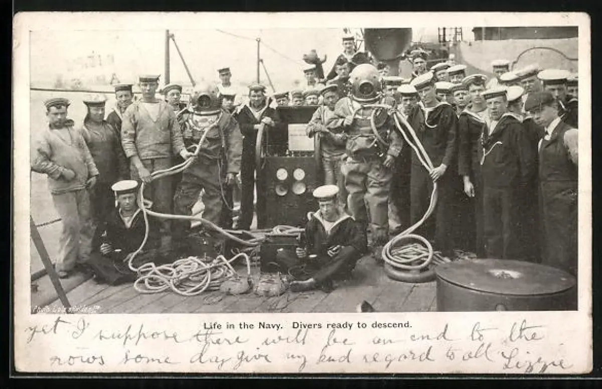 AK Matrosen und Taucher auf einem Kriegsschiff