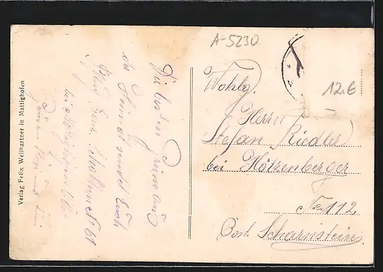 Personenbezogene Daten auf der Rückseite der Karte wurden durch blauen Textmarker unkenntlich gemacht. Die blauen Stellen sind auf die Vorderseite durchgeweicht und wirken sich negativ auf das Postkartenfoto aus
