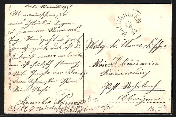 alte Ansichtskarte, gelaufen 1914, Briefmarke entfernt, rückseitig Oberflächenschaden, guter Zustand