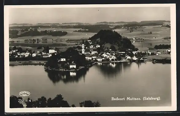 AK Mattsee, Ortsansicht mit See aus der Vogelschau