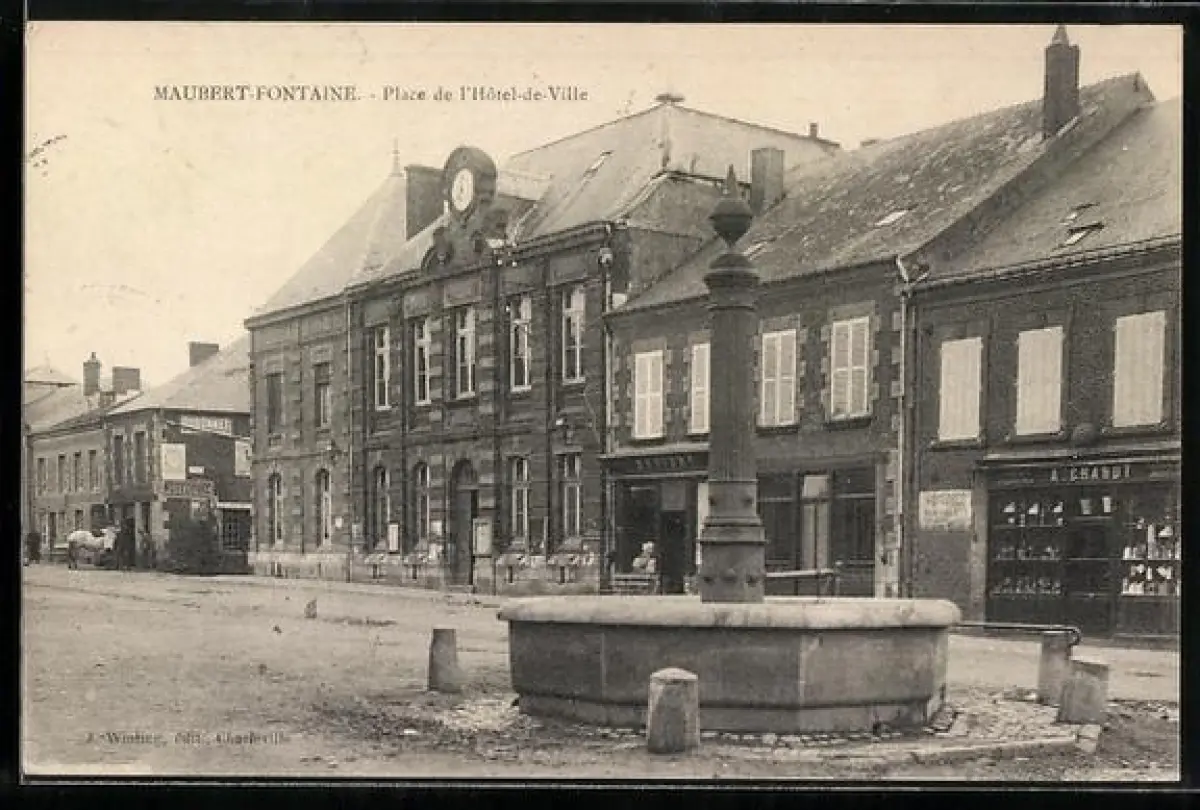 AK Maubert-Fontaine, Place de l`Hotel de Ville, Brunnen vor dem Rathaus