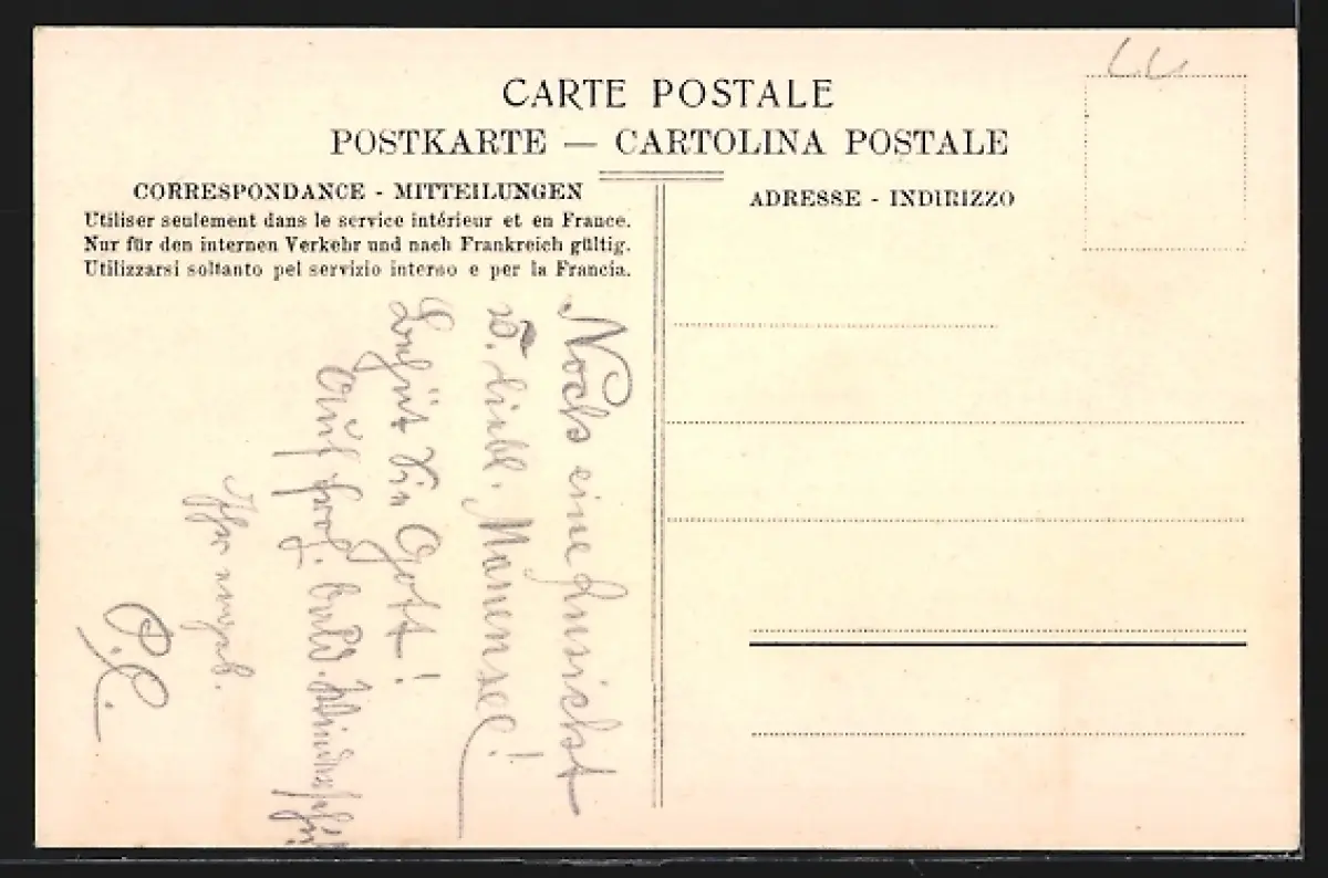 Personenbezogene Daten auf der Rückseite der Karte wurden durch blauen Textmarker unkenntlich gemacht. Die blauen Stellen sind auf die Vorderseite durchgeweicht und wirken sich negativ auf das Postkartenfoto aus