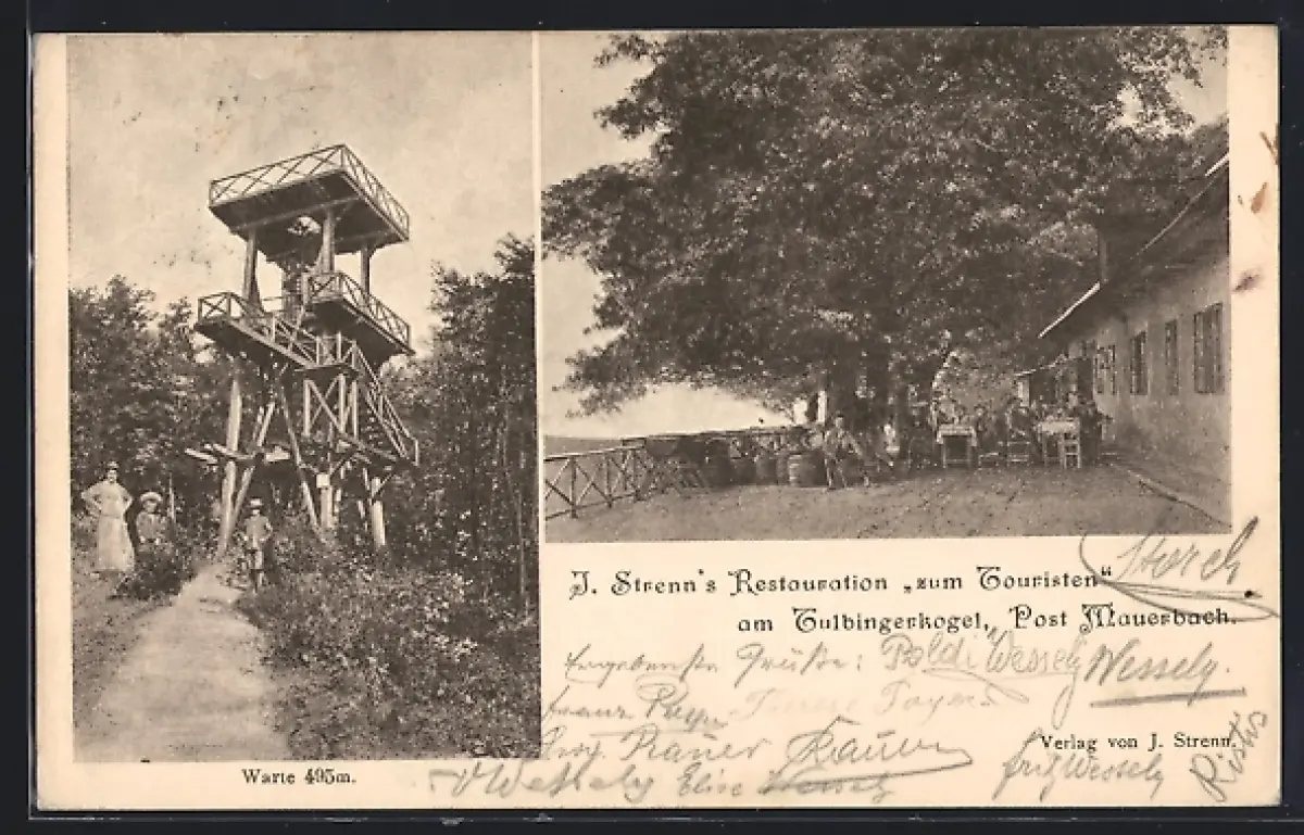 AK Mauerbach, J. Strenns Restauration zum Touristen am Tulbingerkogel, Aussichtsturm