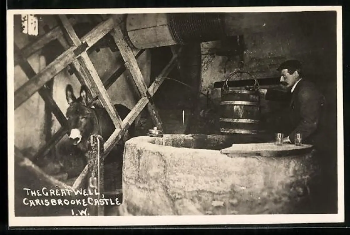 AK Maultier zieht den Eimer im Brunnen durch ein Seil hoch