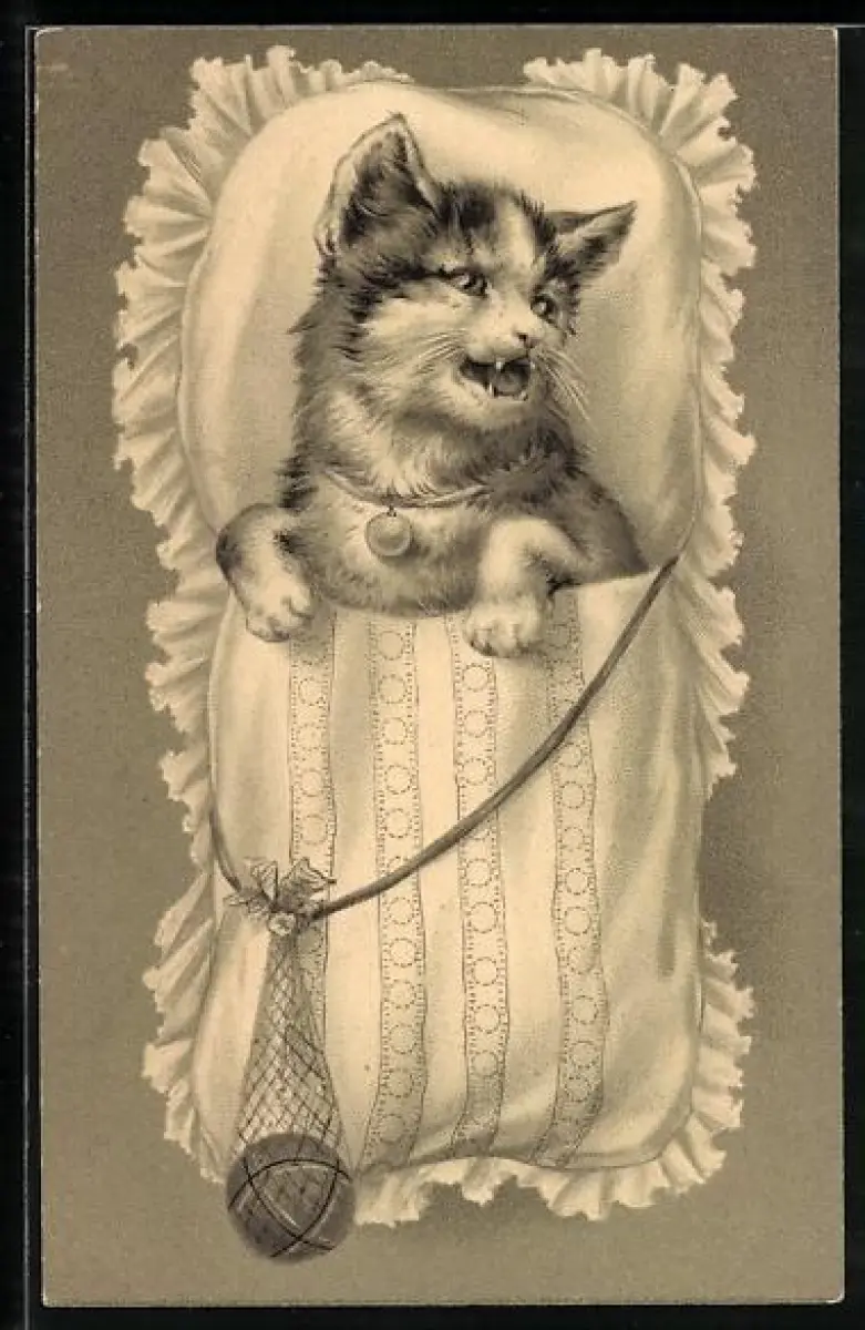 AK Maunzendes Kätzchen im Schlafsack mit Ball