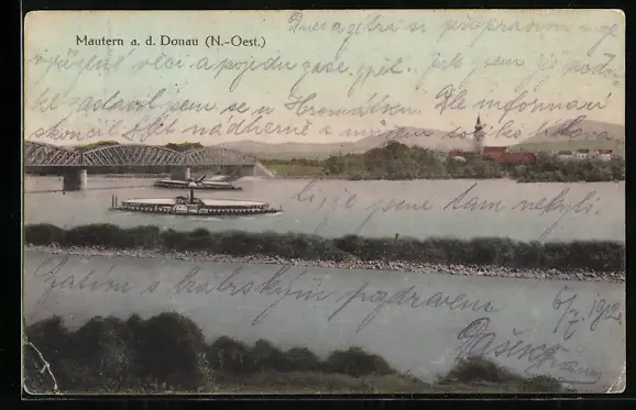 AK Mautern a. d. Donau, Blick über den Fluss mit Dampfern