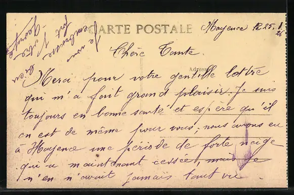 Personenbezogene Daten auf der Rückseite der Karte wurden durch blauen Textmarker unkenntlich gemacht. Die blauen Stellen sind auf die Vorderseite durchgeweicht und wirken sich negativ auf das Postkartenfoto aus