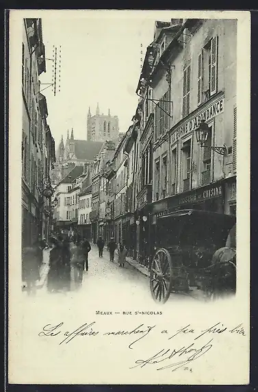 AK Meaux, Rue St-Nicolas avec vue sur la cathédrale et animation urbaine