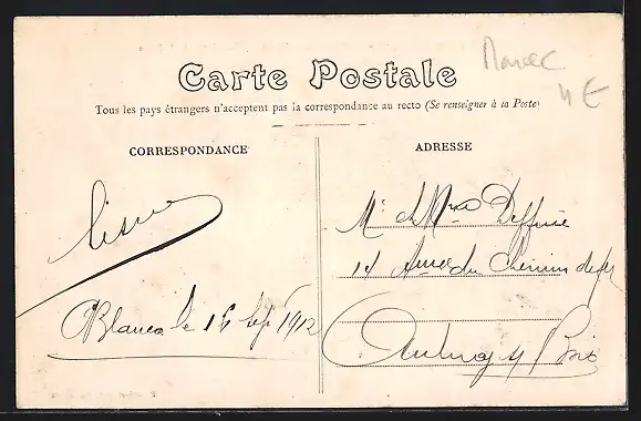 Personenbezogene Daten auf der Rückseite der Karte wurden durch blauen Textmarker unkenntlich gemacht. Die blauen Stellen sind auf die Vorderseite durchgeweicht und wirken sich negativ auf das Postkartenfoto aus