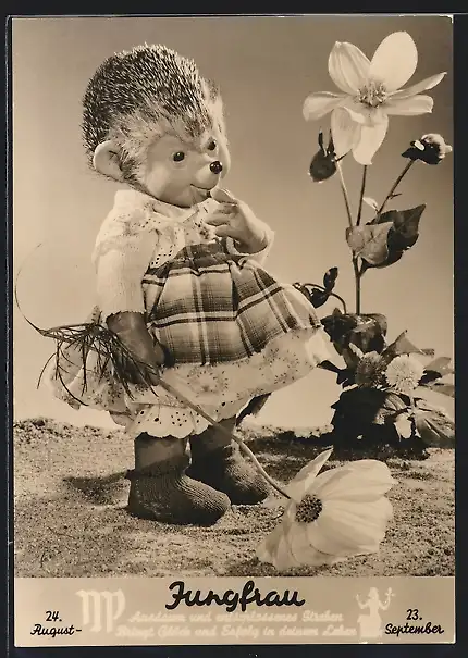 AK Mecki-Frau mit Blumen im Monat Jungfrau