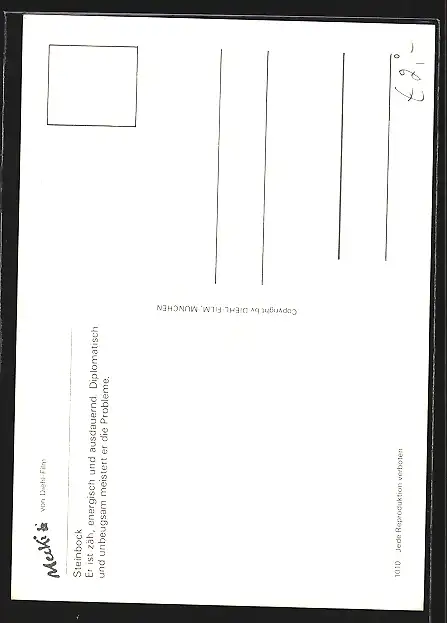Personenbezogene Daten auf der Rückseite der Karte wurden durch blauen Textmarker unkenntlich gemacht. Die blauen Stellen sind auf die Vorderseite durchgeweicht und wirken sich negativ auf das Postkartenfoto aus