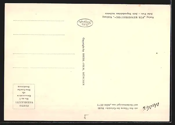 Personenbezogene Daten auf der Rückseite der Karte wurden durch blauen Textmarker unkenntlich gemacht. Die blauen Stellen sind auf die Vorderseite durchgeweicht und wirken sich negativ auf das Postkartenfoto aus