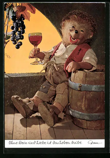 AK Mecki sitzt mit einem Weinglas in der Hand neben einem Weinfass
