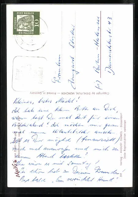 Personenbezogene Daten auf der Rückseite der Karte wurden durch blauen Textmarker unkenntlich gemacht. Die blauen Stellen sind auf die Vorderseite durchgeweicht und wirken sich negativ auf das Postkartenfoto aus