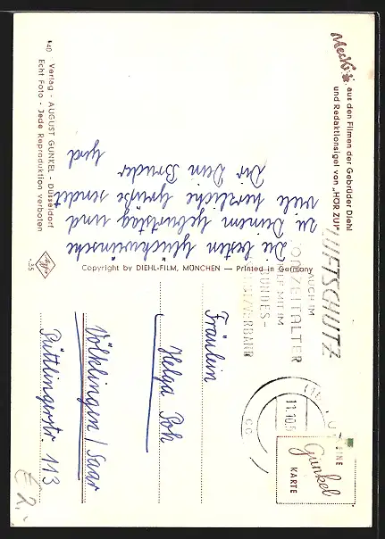 Personenbezogene Daten auf der Rückseite der Karte wurden durch blauen Textmarker unkenntlich gemacht. Die blauen Stellen sind auf die Vorderseite durchgeweicht und wirken sich negativ auf das Postkartenfoto aus