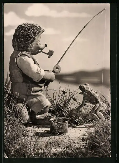 AK Mecki, zufrieden mit Pfeife und Angel am See, Frosch