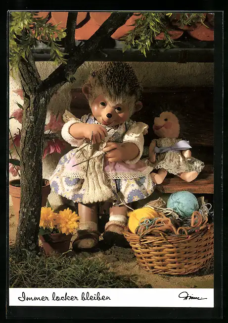 AK Meckis Frau sitzt strickend im Garten