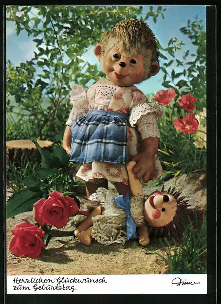AK Meckis Tochter steht lächelnd im Garten, Herzlichen Glückwunsch zum Geburtstag!
