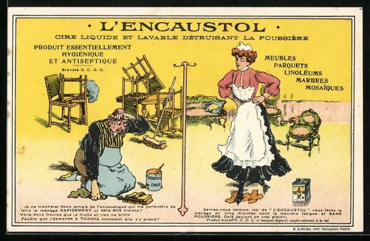 AK Medikament L`Encaustol Cire Liquide et Lavable Detruisant la Poussiere, Dienstmädchen beim Bodenwischen