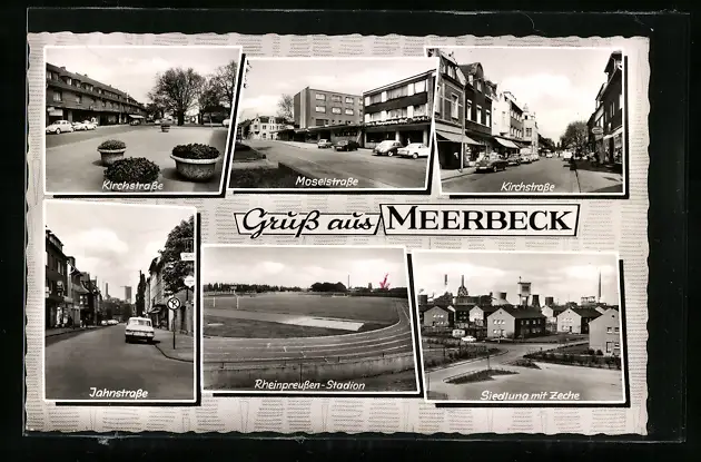 AK Meerbeck, Moselstrasse mit Geschäft, Kirchstrasse mit Geschäft, Siedlung mit Zeche