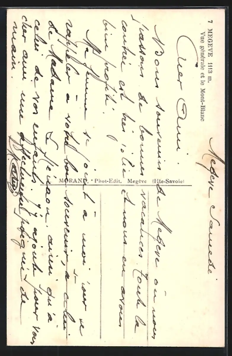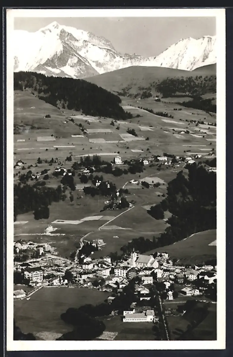 AK Megève, Vue générale et le Mont-Blanc en arrière-plan