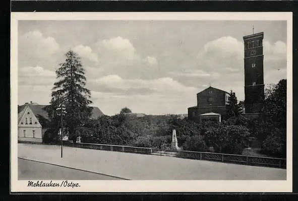 AK Mehlauken /Ostpr., Strassenpartie mit Kirche