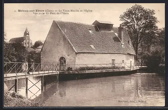 AK Mehun-sur-Yèvre, Le Vieux Moulin et l`Église vue prise du Pont de l`Yèvre