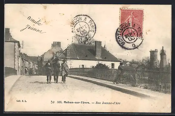 AK Mehun-sur-Yèvre, Rue Jeanne-d`Arc avec passants sur le pont