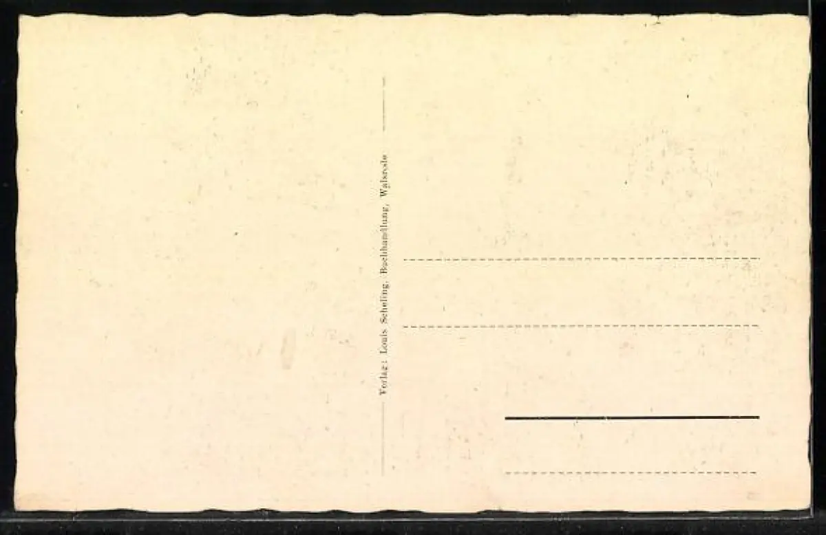 Personenbezogene Daten auf der Rückseite der Karte wurden durch blauen Textmarker unkenntlich gemacht. Die blauen Stellen sind auf die Vorderseite durchgeweicht und wirken sich negativ auf das Postkartenfoto aus