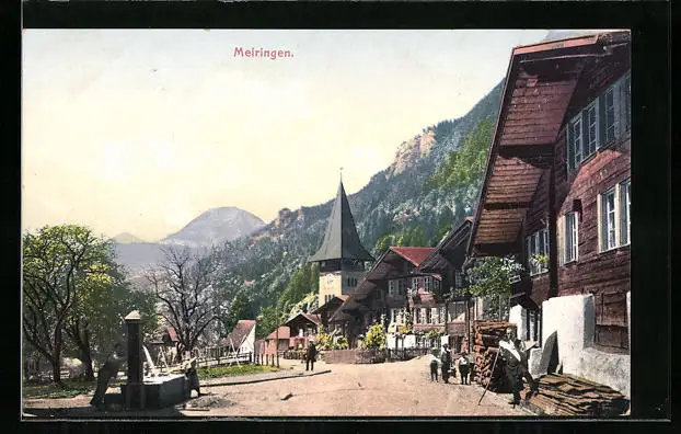 AK Meiringen, Strassenpartie mit Brunnen und Kirche