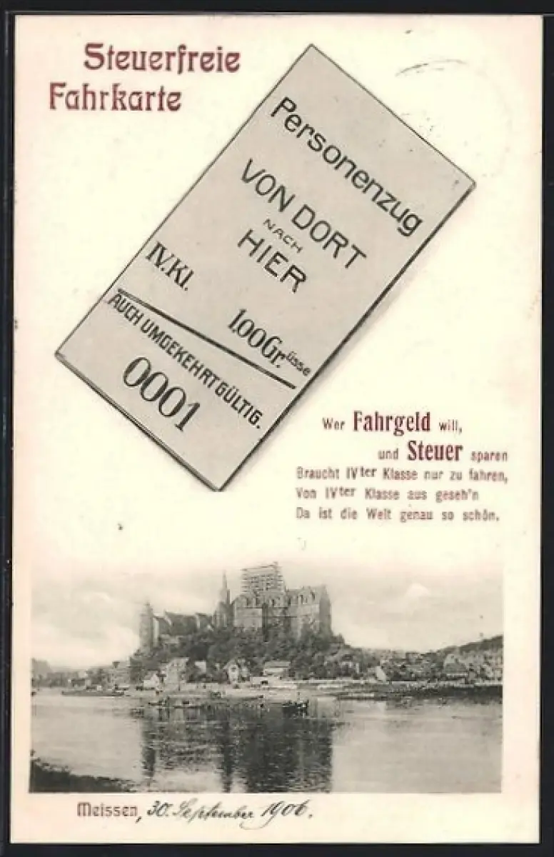 AK Meissen / Elbe, Steuerfreie Fahrkarte von Dort nach Hier, Teilansicht der Stadt mit Kirche