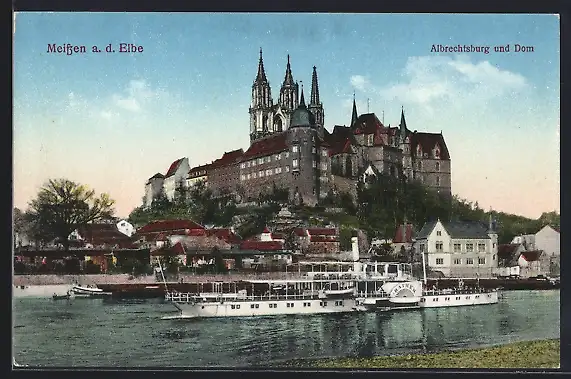 AK Meissen a. d. Elbe, Dampfer Rathen vor Albrechtsburg und Dom