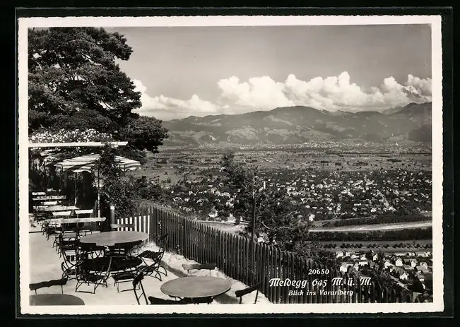 AK Meldegg, Blick von einer Cafe-Terrasse ins Vorarlberg