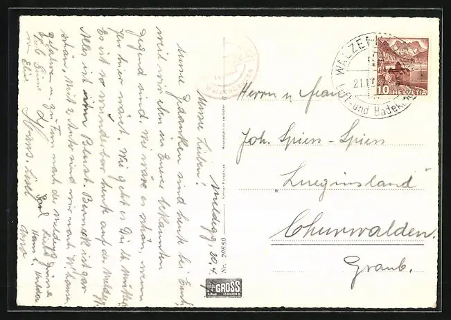 Personenbezogene Daten auf der Rückseite der Karte wurden durch blauen Textmarker unkenntlich gemacht. Die blauen Stellen sind auf die Vorderseite durchgeweicht und wirken sich negativ auf das Postkartenfoto aus