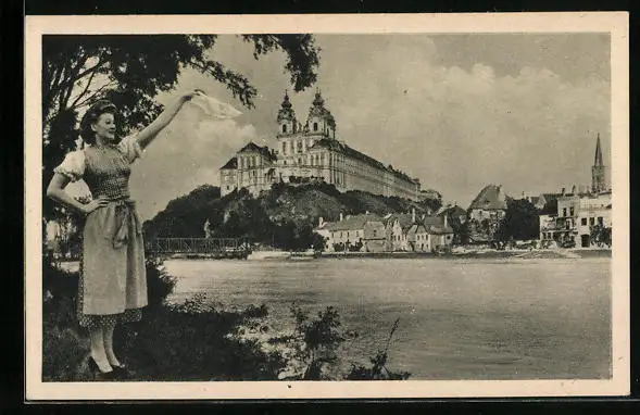 AK Melk a. d. Donau, Blick zum Stift, Österreicherin winkt am Donauufer
