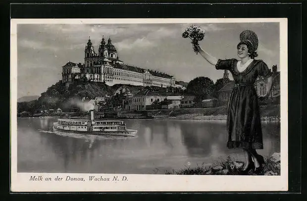 AK Melk a. d. Donau, Panoramablick zum Stift, Österreicherin im Trachtenkleid