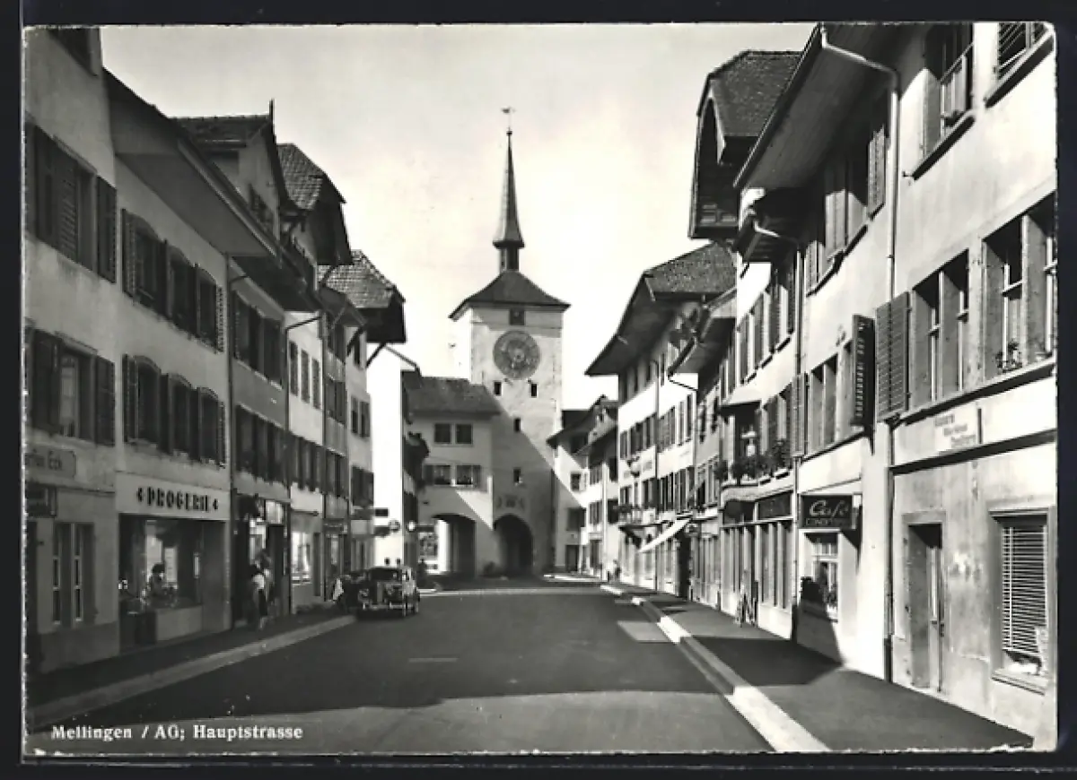 AK Mellingen /AG, Hauptstrasse mit Torturm und Geschäften, Cafe-Conditorei