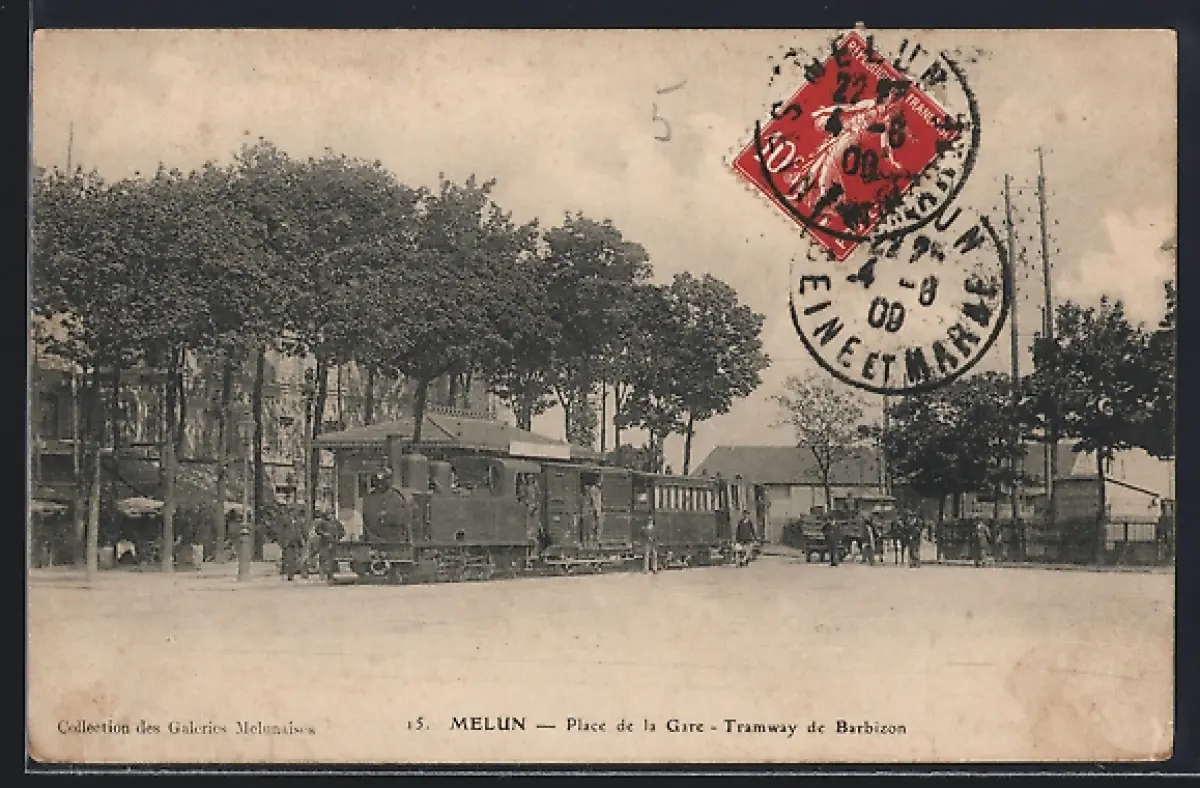 AK Melun, Place de la Gare, Tramway de Barbizon, Kleinbahn