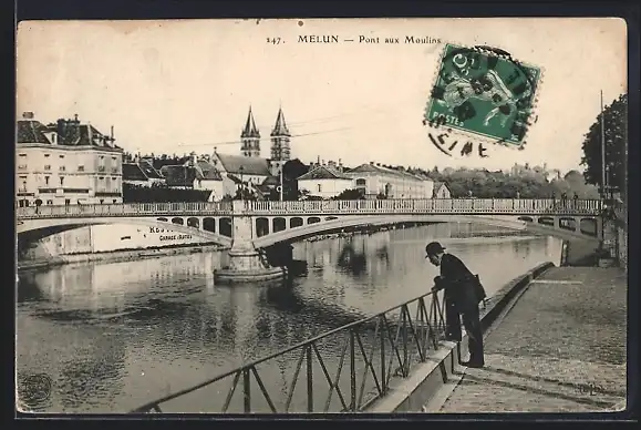 AK Melun, Pont aux Moulins et vue sur la rivière avec un passant en premier plan