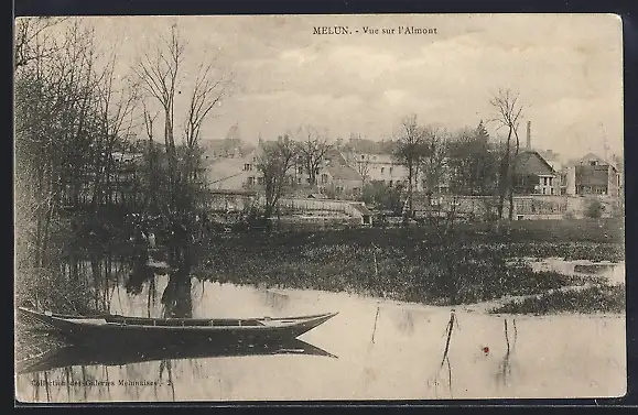 AK Melun, Vue sur l`Almont avec paysage fluvial et barque