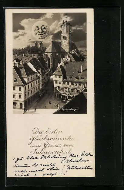 AK Memmingen, Der Mond lächelt freundlich auf die Stadt herab, Neujahrsgruss