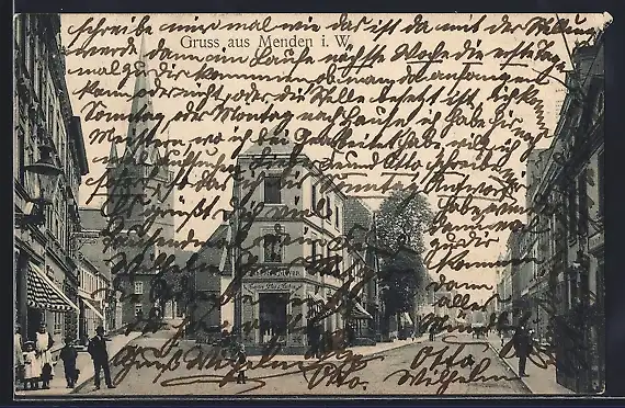 AK Menden i. W., Strassenpartie mit Geschäft Alberts & Meyer