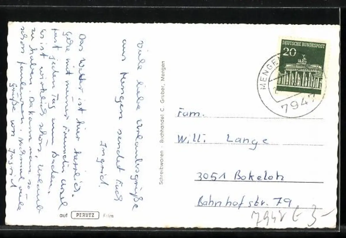 Personenbezogene Daten auf der Rückseite der Karte wurden durch blauen Textmarker unkenntlich gemacht. Die blauen Stellen sind auf die Vorderseite durchgeweicht und wirken sich negativ auf das Postkartenfoto aus