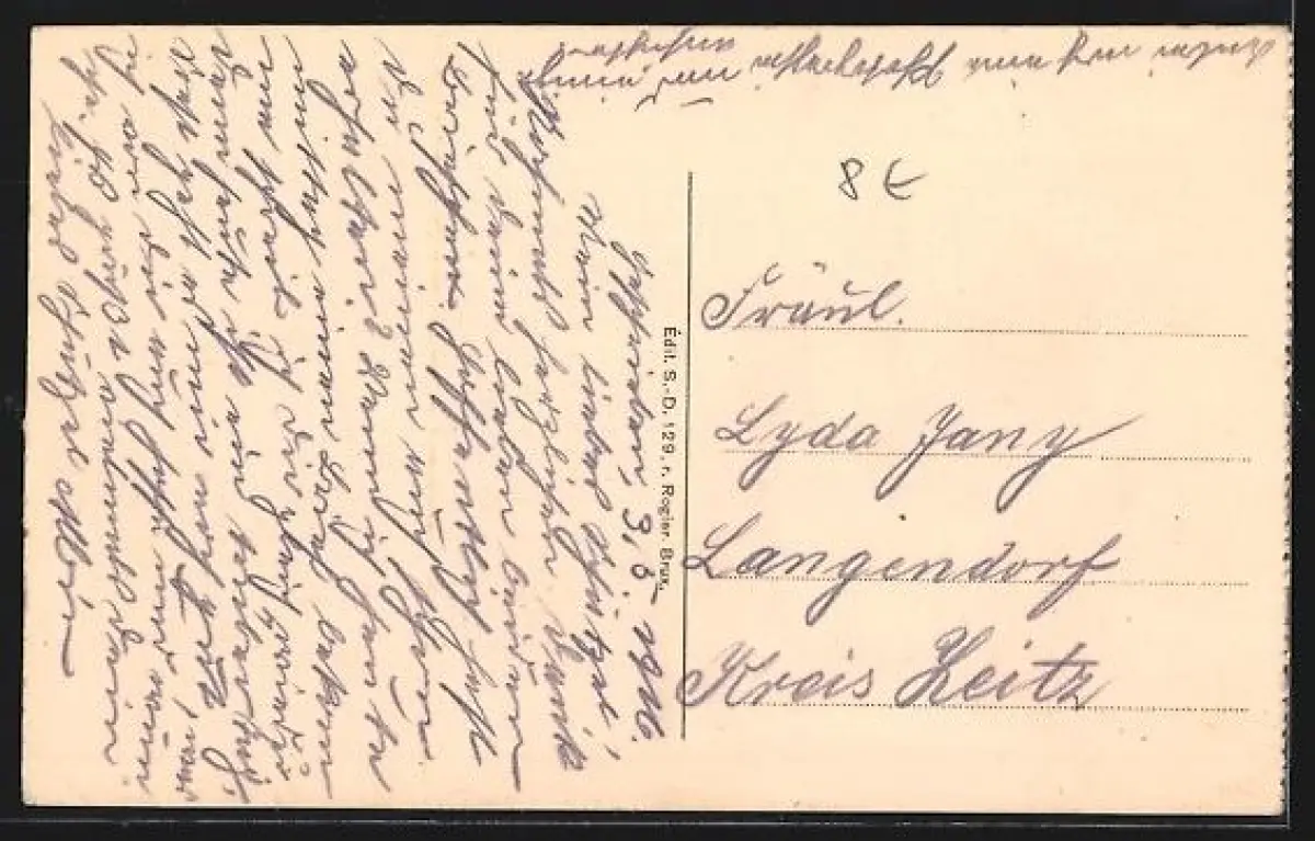 Personenbezogene Daten auf der Rückseite der Karte wurden durch blauen Textmarker unkenntlich gemacht. Die blauen Stellen sind auf die Vorderseite durchgeweicht und wirken sich negativ auf das Postkartenfoto aus