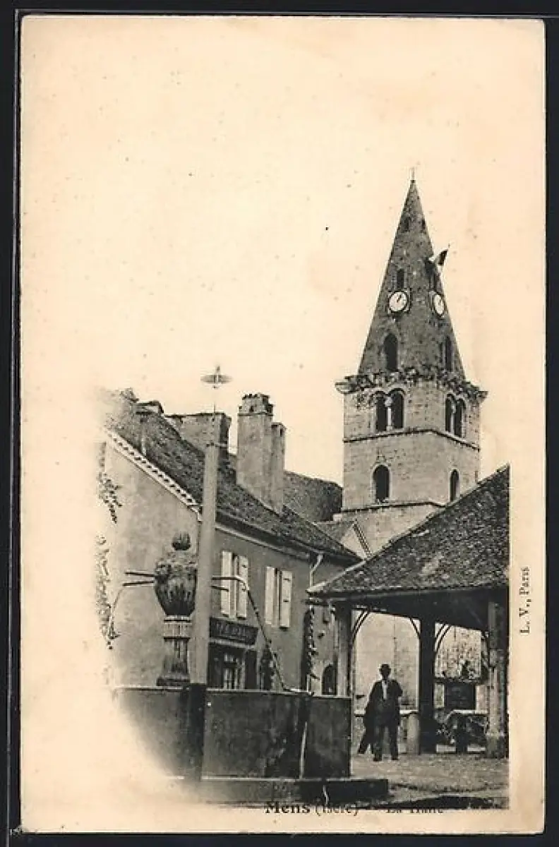 AK Mens /Isère, Église et place du village avec clocher et habitants