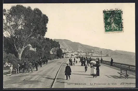 AK Menton, La Promenade du Midi avec des promeneurs et vue sur la mer
