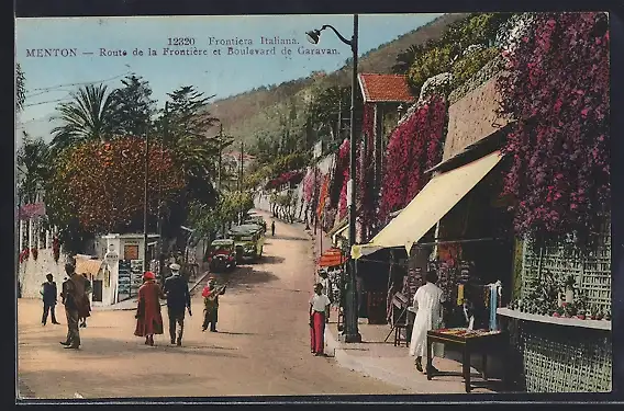 AK Menton, Route de la Frontière et Boulevard de Garavan avec piétons et voitures