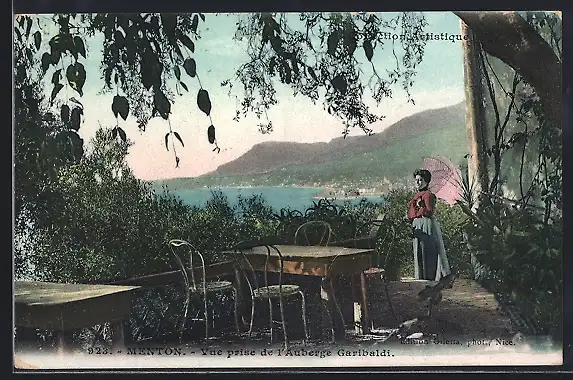 AK Menton, Vue prise de l`Auberge Garibaldi avec vue sur la mer et les collines