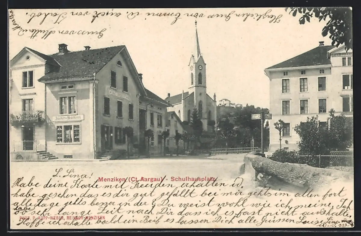 AK Menziken /Aargau, Gasthaus Waage und Kirche am Schulhausplatz